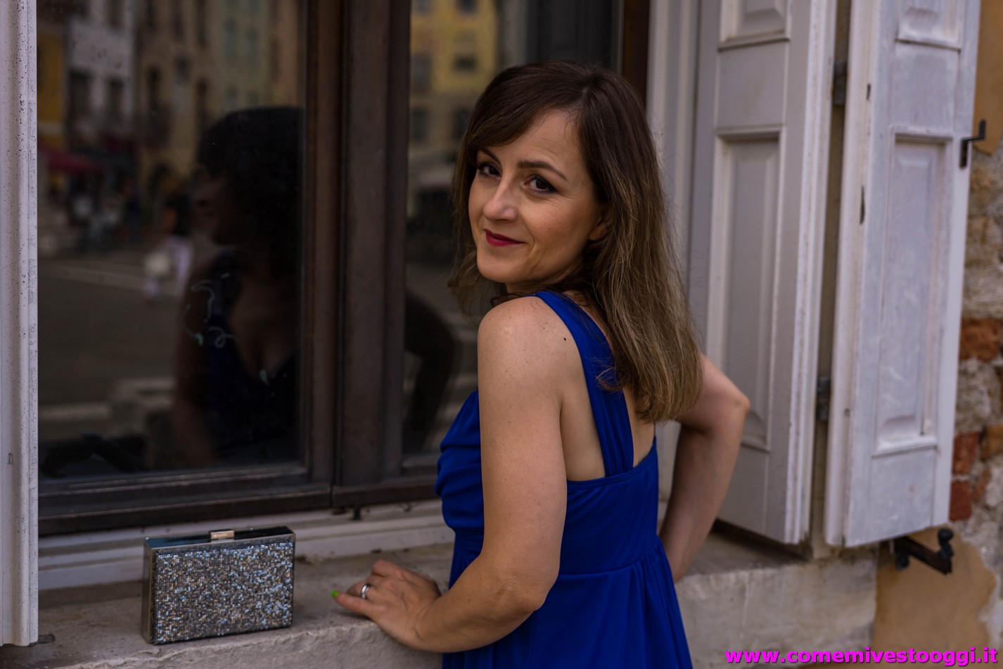 Ma quando arriva la sera il look si trasforma...e allora per una cenetta romantica in riva al mare, abitino fru fru in maglina e chiffon blu royal, con drappeggi sullo scollo a V e le spalline impreziosite da pailletes. La gonna è leggera, vaporosa e drappeggiata in delicato chiffon.