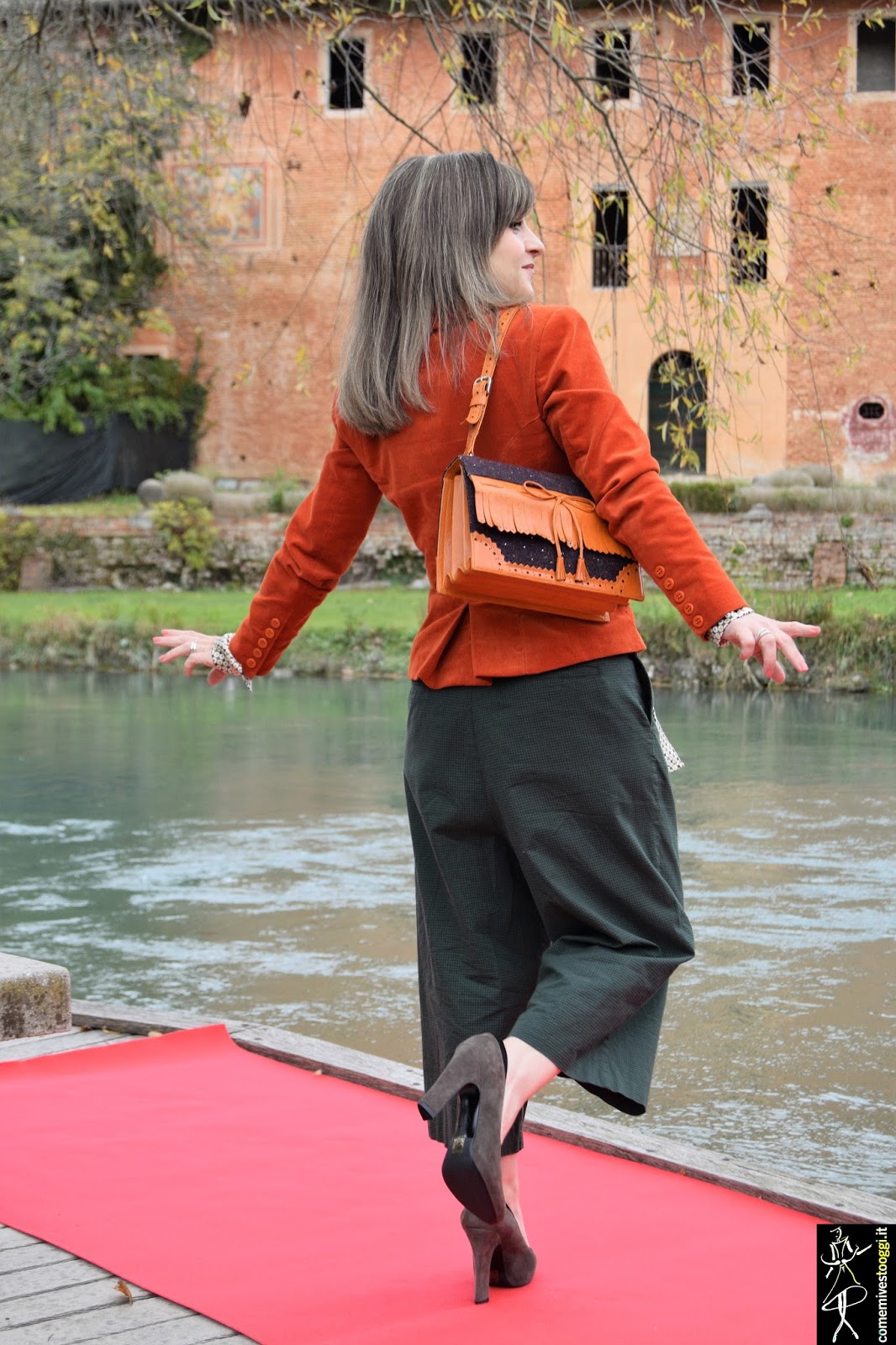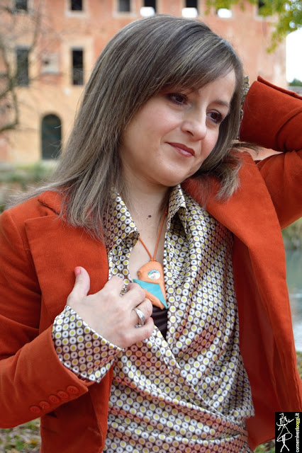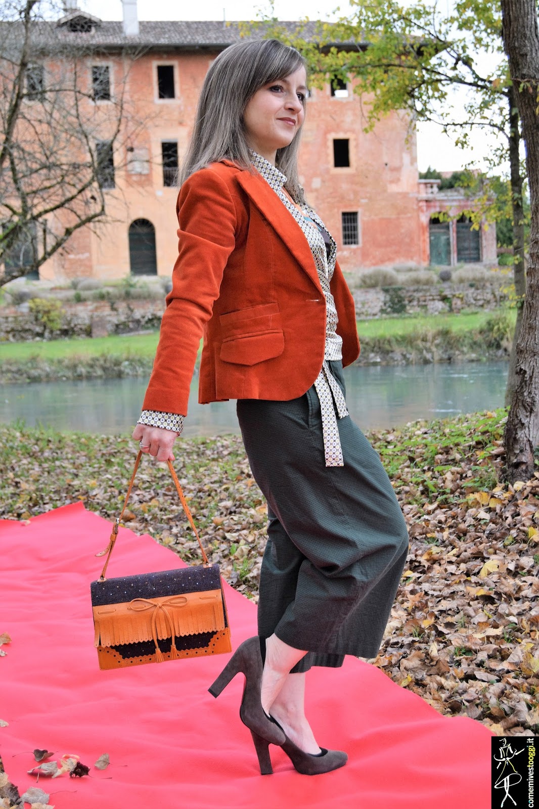 Mi sono permessa di rubare i colori alla natura e indossarli oggi per voi. Questo splendido arancio color delle foglie autunnali l'ho abbinato a questi carinissimi pantaloni culotte color verde bosco, molto di moda per questo inverno. Sono a metà tra una gonna-pantalone e un pantalone a palazzo, fermandosi però appena sopra la caviglia. Nonostante la mia piccola figura devo dire che non mi dispiacciono affatto, il trucco è un tacco 12 come sempre e la camicetta scaldacuore optical portata quasi a giro vita, per allungare la gamba. Queste culotte hanno una chiccheria in più che mi ha conquistata e cioè la loro chiusura sul davanti a portafoglio, originali vero?